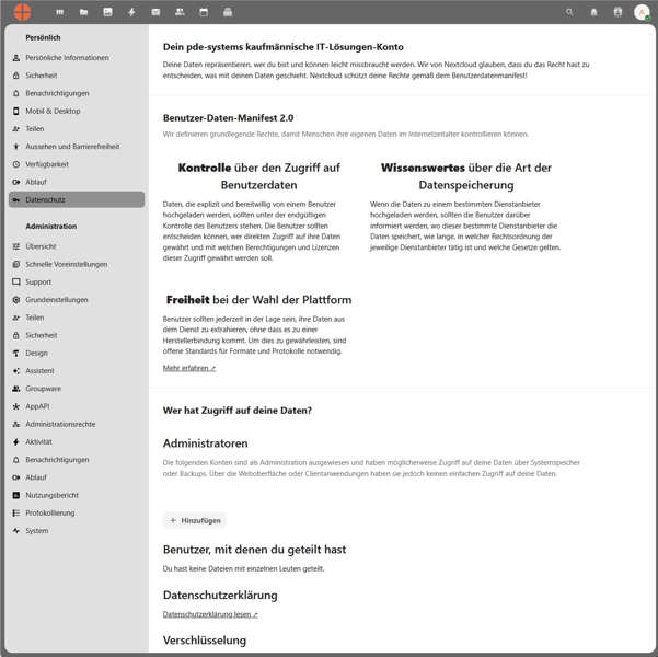 Nextcloud ist die Kollaborationslösung mit der Sie die volle Kontrolle über Ihre Daten behalten. Ob als lokale Installation auf eigener Hardware, oder in der Cloud, mit Nextcloud werden Sie den heutigen Datenschutzanforderungen gerecht. Der Quellcode von Nextcloud ist unter der Open Source-Lizenz GNU Affero General Public License (V3) nutzbar.